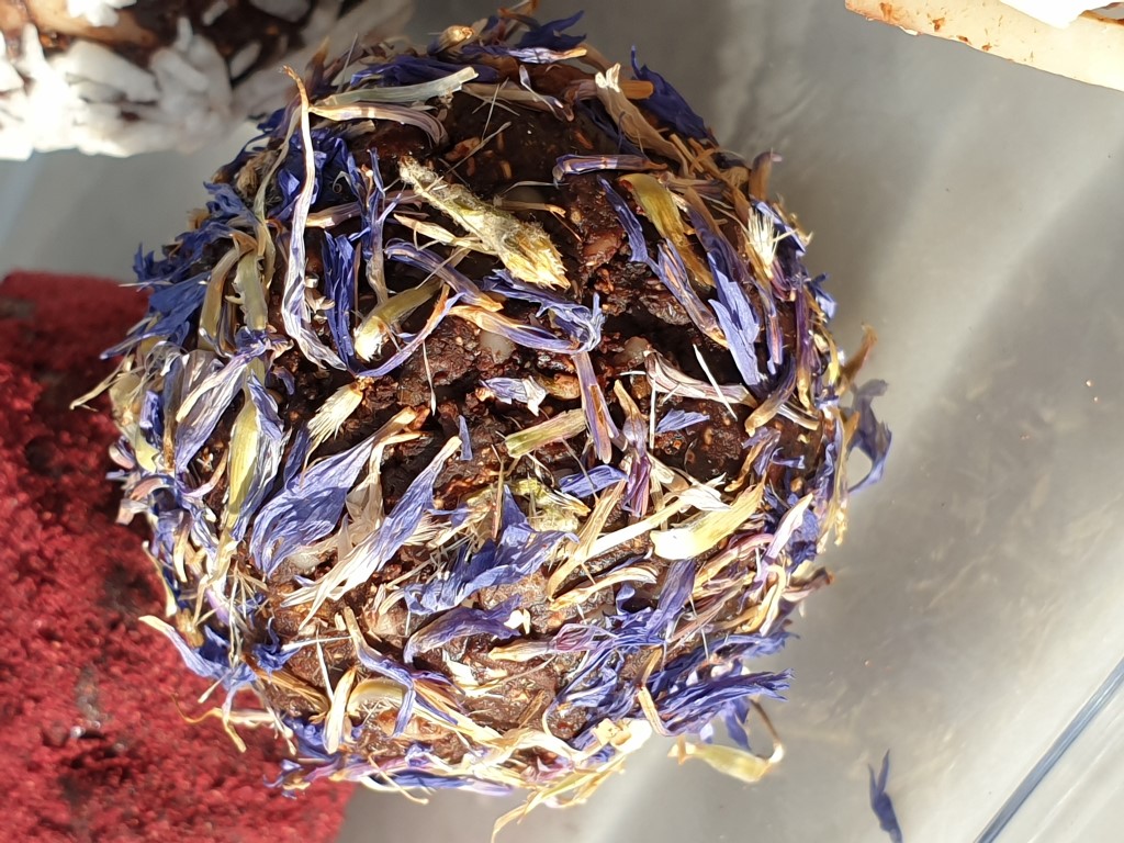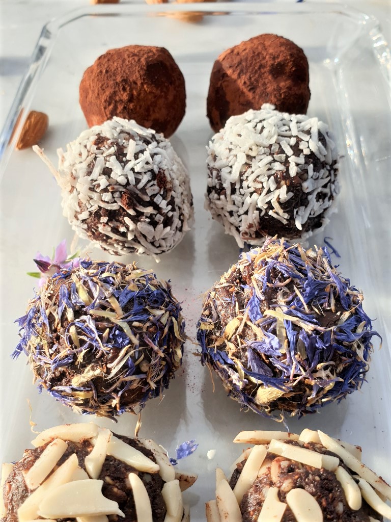 Your choice of ingredients to roll the balls in; I used cornflowers, slivered almonds, coconut, cocoa powder and freeze-dried black currant powder