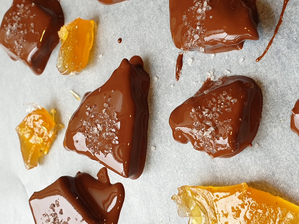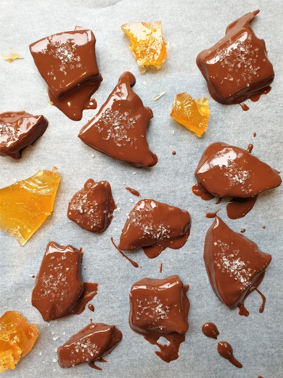 - Break into pieces, then coat in melted chocolate and add your favourite topping.