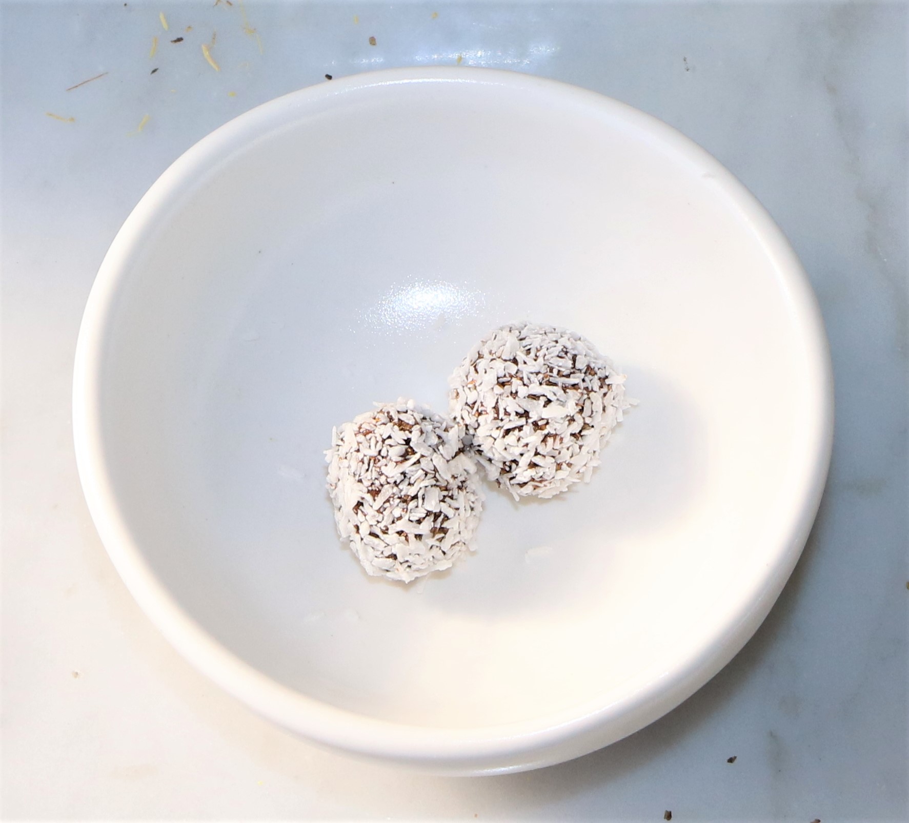 - Take a small amount of the mixture, equivalent to about the size of a large blueberry, and push the mixture together between your fingers to form a ball, then roll the ball in coconut.